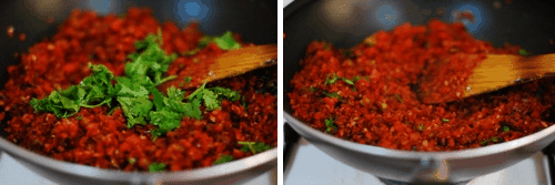 - Heat oil in a wide pan. Add the chopped onion and cook till it becomes soft and starts browning. Add chopped ginger, garlic,green chilli and curry leaves. Cook for 2-3 mins or till the raw smell goes. Add all the masala powders and mix well. Cook for another 2-3 mins. Add the cooked veggies and salt, mix well. Add chopped coriander leaves. Combine and continue to cook for 5 more mins on low flame.