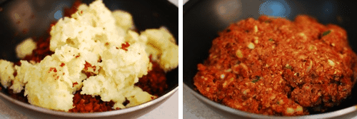 - Let the veggie mixture cool completely. Add the mashed potatoes to the veggie mixture and mix well.Make sure there are no lumps. Shape the mixture as per your liking.