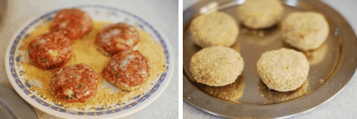 - Make a medium thick paste with plain flour and water. Mix together the bread crumbs and rava (if using). Dip the shaped cutlets in this batter & roll in bread crumbs. At this stage the cutlets are ready to freeze. You can store it in a ziplock bag & freeze it for 1-2 months. Keep the frozen cutlets at room temp for 30-45 mins before frying.