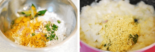 - Combine coconut, small onion, green chilli, garlic, jeera, curry leaves and turmeric powder using your finger tips (njeraduka).