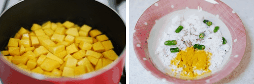 - Grind together coconut, jeera, green chilli, turmeric powder with 2.5 tbsp water. Add the coconut paste to mashed mathanga, mix well and cook on low flame for 5-7 mins.
