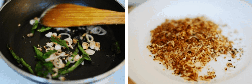 - Heat oil in a pan and fry the coconut till it turns golden brown. Keep it aside. In the same pan, add more oil and crackle mustard. Add sliced onions and curry leaves. Fry till the small onions turns golden brown. Pour this over the cooked mathanga. Garnish with fried coconut.
