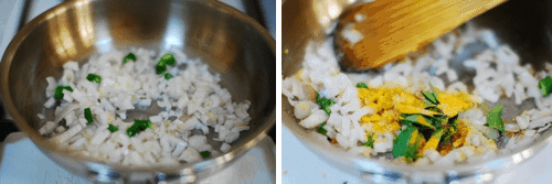 Heat oil in a pan and add the chopped onion and green chilli. When onions become soft (no need to brown), add turmeric powder, salt and curry leaves. Mix well…