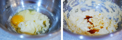 Add in the eggs one at a time and vanilla and mix until blended, scraping the sides of the bowl as necessary.