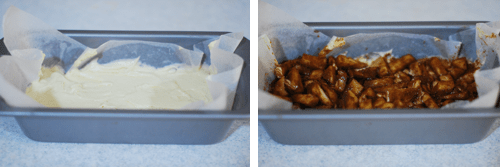 Pour half of the batter into the prepared pan. Distribute half of the apple mixture on top of the batter. Sprinkle half of the cinnamon-sugar mixture over the apples. Using the end of a dull knife, gently swirl the brown sugar mixture and the apples into the batter.