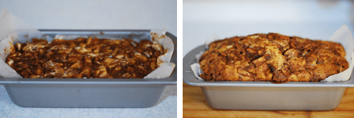 Pour remaining batter into the pan, followed by the remaining apple mixture and remaining cinnamon-sugar mixture. Again, gently swirl the sugar and apple mixture into the batter. If needed press the apples into the batter. Bake for 50-60 minutes, or until a toothpick inserted into the center comes out clean.