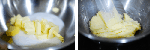 In the bowl of a mixer, combine butter and sugar and beat well to combine (mixture will be fairly dry).