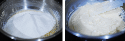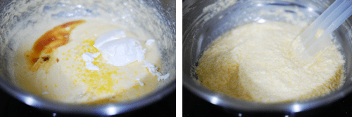 Add sour cream, vanilla and lemon extracts, lemon zest and lemon juice and beat until well combined.